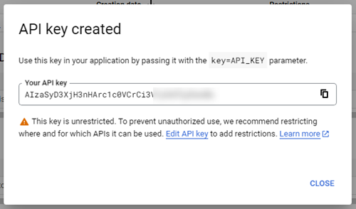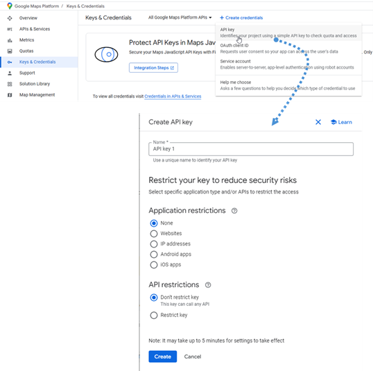 For the map to appear and work properly, you must add a Google Maps API Key. Open Google Cloud Console. Then, create or select the project you want to use. Click + Create credentials, then select API Key.