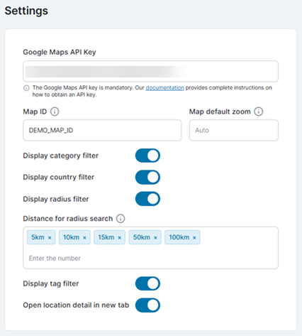 Back in your WordPress dashboard, go to WP Location Finder > Settings. Enter the Google Maps API Key and Map ID that you created earlier.
