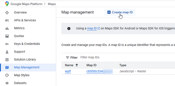 After everything is active, you can proceed to the next step, which is creating a Map ID to display maps with specific configurations. To create it, open the Map Management page in Google Cloud Console, then select the Create Map ID button.