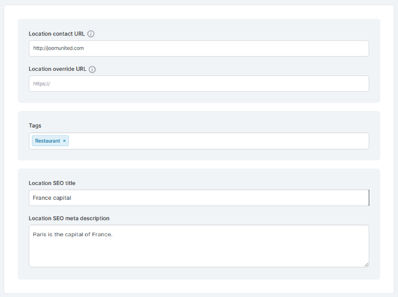 - Location contact URL & Override URL: Add a contact link or override URL if needed.