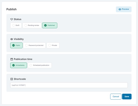 You can also select one or more categories for the location. In the Publish section, specify the status (Draft, Pending Review, or Published), visibility settings (Public, Password Protected, or Private), and publication time (immediate or scheduled). After that, the shortcode will automatically appear and can be used to display the location on any page on your site.