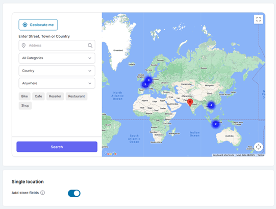 The layout of the location search form can also be customized to look cleaner and more integrated with your website design. You can adjust settings like search radius, category filters, and country dropdowns to fit your design preferences.